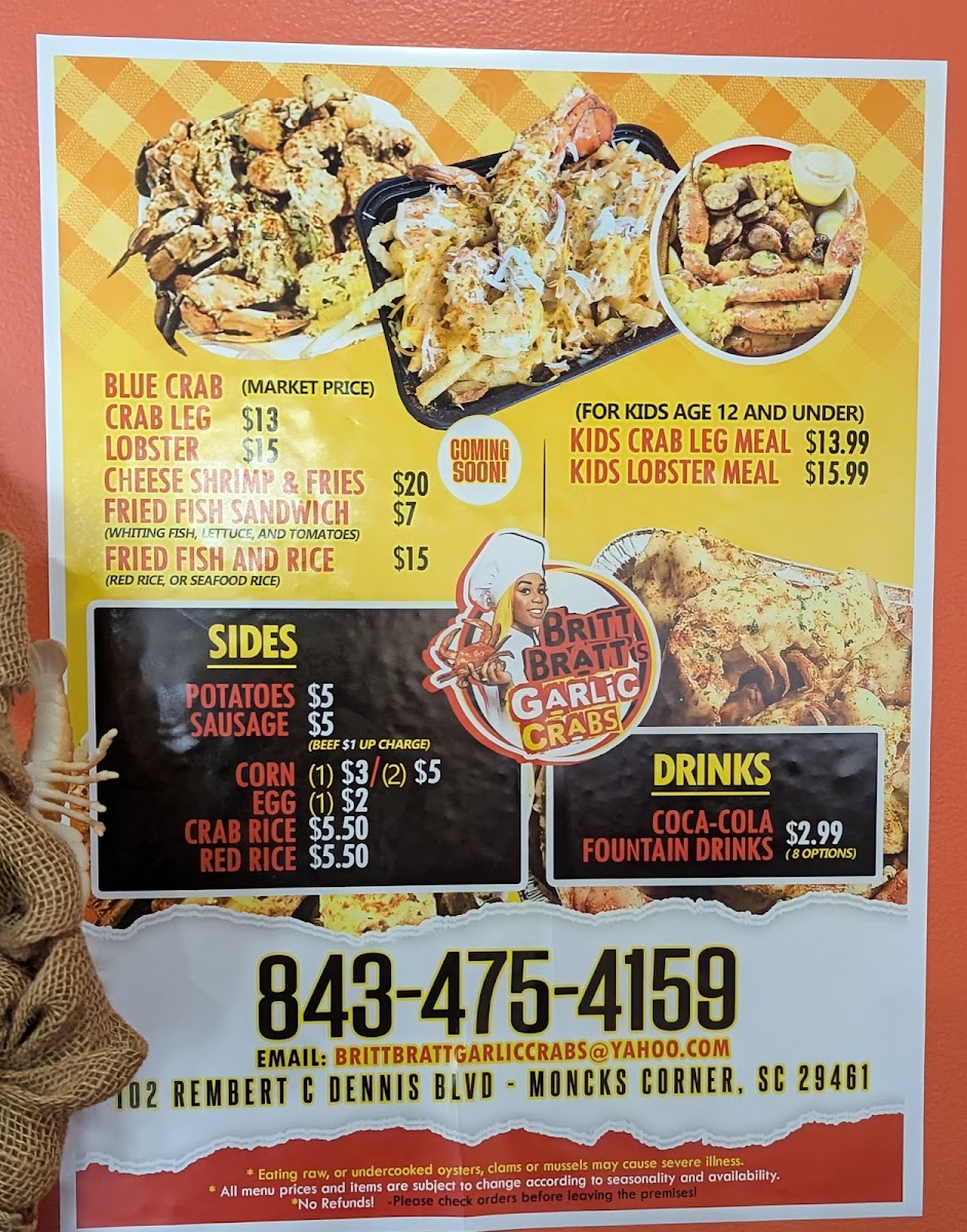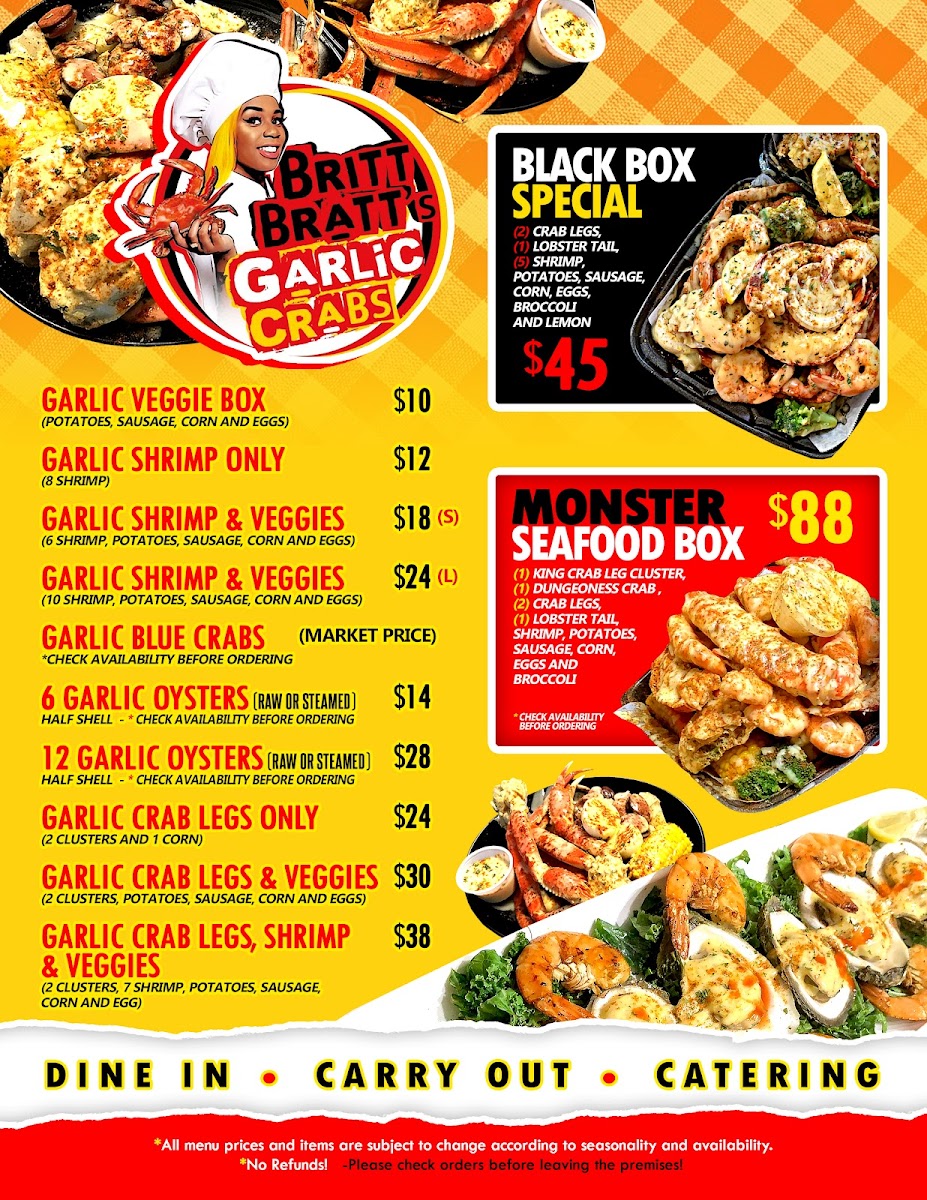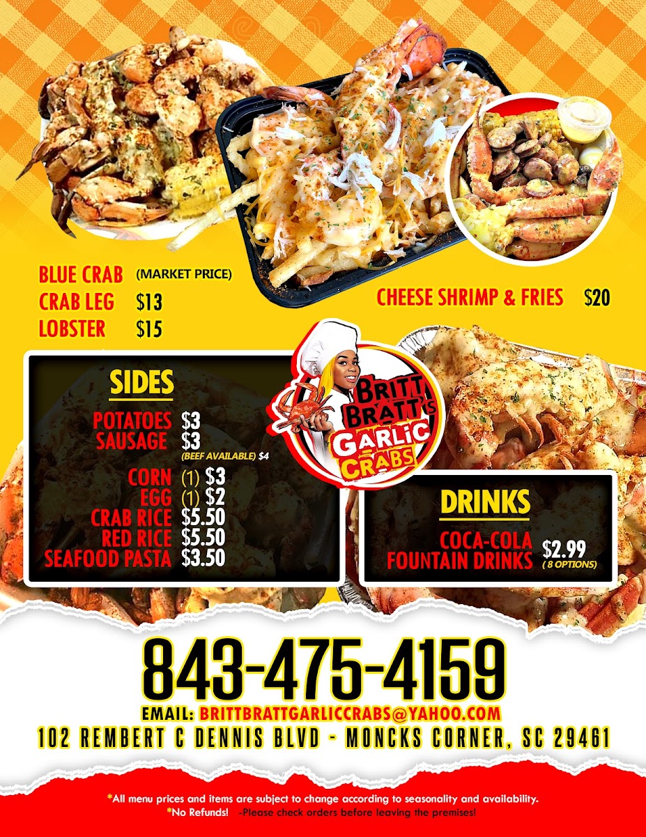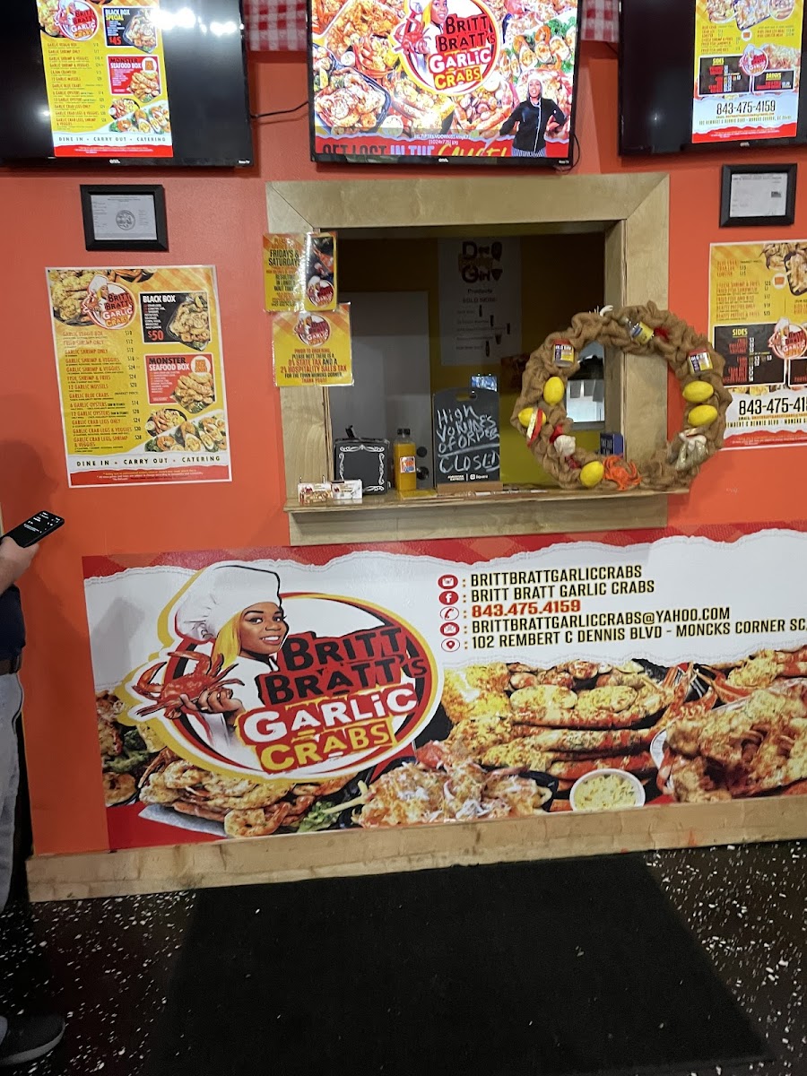 Welcome to Britt Bratt Garlic Crabs, a seafood haven nestled in Moncks Corner, SC. Known for their delectable garlic crabs and generous portions, this eatery has quickly become a favorite among seafood enthusiasts. Guests rave about the Black Box, overflowing with tender, perfectly seasoned lobster, and succulent garlic oysters. Customers appreciate the attentive service and cleanliness of the establishment, which enhances the overall dining experience. While some diners noted minor issues like cooking times for sides, the overwhelming consensus is that the dishes deliver on flavor and value.